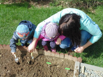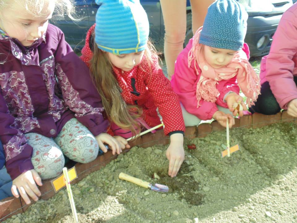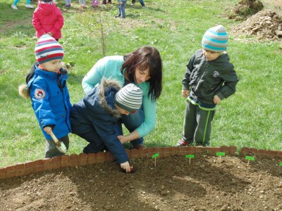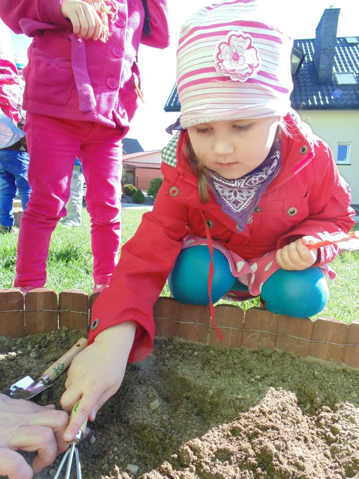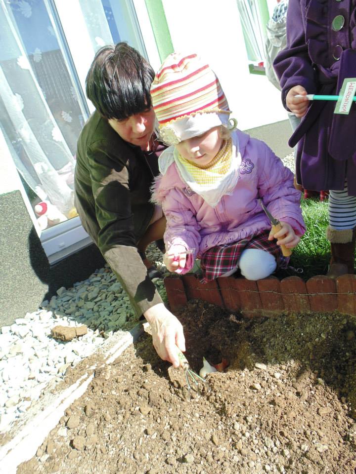 Wyposażeni w profesjonalne narzędzia, czyli grabki i łopatki, każdy przedszkolak wsadził do ziemi cebulkę tulipana. Miejsce zasadzenia zaznaczyliśmy specjalnymi tabliczkami, dzięki którym dowiemy się przez kogo dany kwiat był posadzony.