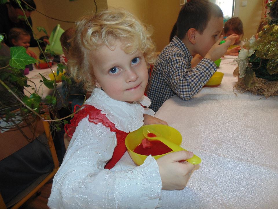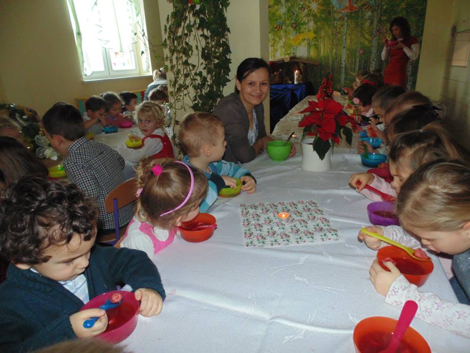 Kiedy wszystko było już gotowe, wszystkie dzieci zebrały się na świątecznie przygotowanej jadalni. Po wspólnej modlitwie i odśpiewaniu kolędy „Pójdźmy wszyscy do stajenki” łamaliśmy się opłatkami i składaliśmy sobie życzenia. Obiad w tym wyjątkowym dniu zjedliśmy z dużym apetytem. Każdy z nas spróbował wszystkich potraw, bo to przecież wróży dobrobyt i sytość przez cały następny rok.